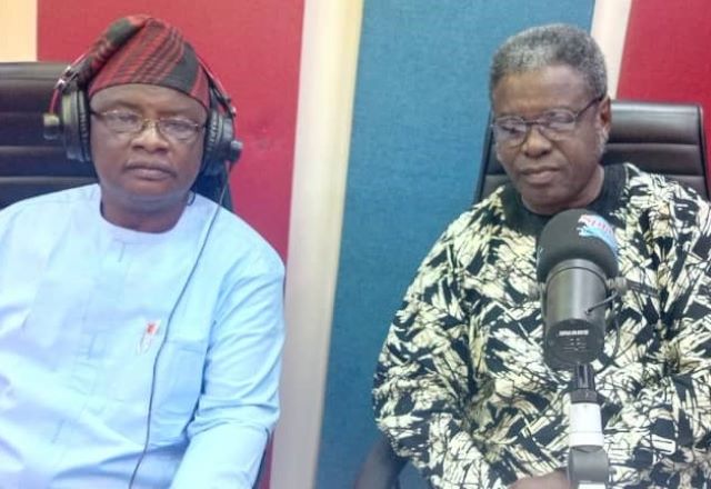 Alagba Biodun Oduwole, right, with Olayinka Agboola...during the live Radio Show on Splash 105.5fm...
