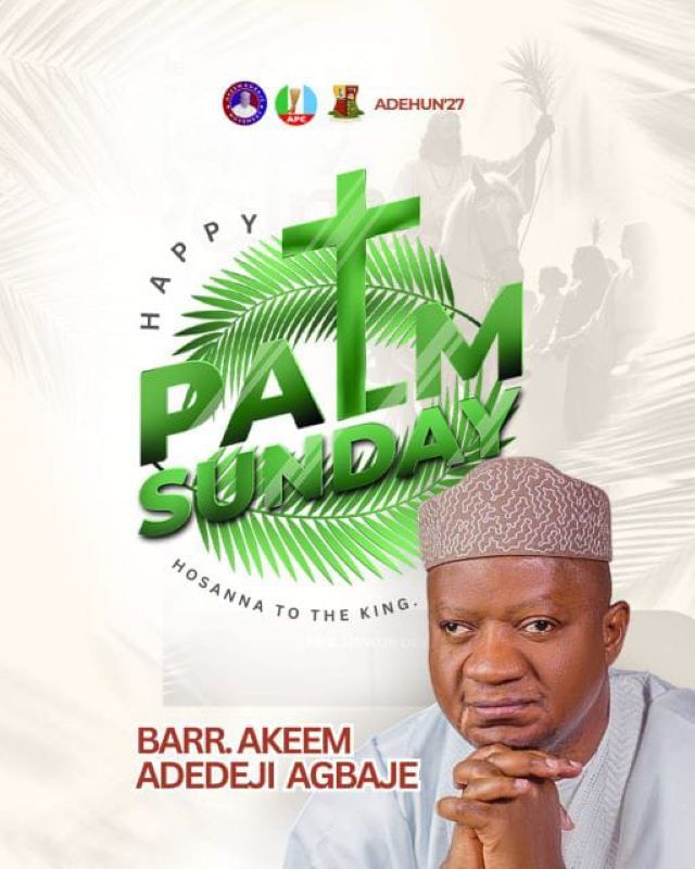 Barr. Akeem Adedeji Agbaje, a chieftain of the All Progressives Congress (APC) and 2027 gubernatorial aspirant in Oyo State, has extended warm greetings to Christians in the state and across Nigeria on the occasion of Palm Sunday.
