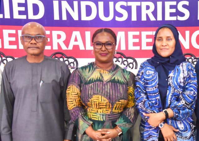 L-R: Chairman, NASCON Allied Industries Plc, Olakunle Alake; Managing Director, NASCON Allied Industries Plc, Aderemi Saka; Non-Executive Director, NASCON Allied Industries Plc, Fatima Aliko Dangote, at the NASCON Allied Industries Plc 2025 Annual General Meeting held in Lagos on Monday, April 27, 2026…